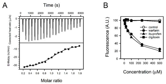 Fisetin appears to react with HSA at 1:1 ratio (Table S1). Both warfarin and ibuprofen could replace fisetin in fisetin–HSA complex. A straightforward interpretation is that fisetin interacts with both sites I and II, and that the interaction with one site might prevent that of the other site. The preference for site I or II does not seem to differ from each other, considering the similar Kd values of warfarin and ibuprofen to HSA (Figure S3 and Table S1) and their comparable fisetin-replacing capabilities (Figure 4B). Indeed, the binding pockets in HSA are quite flexible and there can be an allosteric interaction among the sites, although the characteristics of sites I and II toward ligands are different [,]. Unlike our study, a previous study suggested site I as a major binding pocket for fisetin, based on fluorescence anisotropy and molecular docking studies []. This discrepancy remains hard to explain. However, there are reports suggesting the limitations of pharmacological tools for identifying binding sites, owing to limited specificity []. Indeed, there are pharmacokinetic studies showing that ibuprofen can displace warfarin or quercetin, another site I-binding molecule, from binding sites [,]. More advanced methods will be required for characterizing the binding sites.