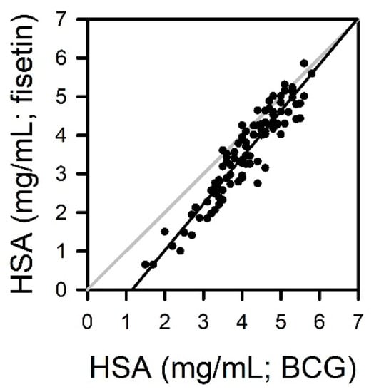 The fisetin-based albumin assay was validated with random human samples in comparison with the BCG method (Figure 5). The measured values from the BCG method seem to be slightly higher than the results obtained with fisetin (4.10 ± 0.09 mg/mL vs. 3.54 ± 0.12 mg/mL), especially in sera with a low albumin level. The reason for the discrepancy is currently elusive, but it might be attributed to the tendency of BCG to overestimate albumin, as described above. Indeed, quite similar results have been reported in previous studies comparing the BCG method with serum protein electrophoresis [,,]. The mean values of albumin from 166 sera were 4.29 and 3.68 g/dL for the BCG method and electrophoresis, respectively []. In the other study, they were 3.76 and 3.13 g/dL in the analysis of 144 sera, respectively []. These studies found the overestimation of albumin by the BCG method, especially in sera with low albumin level, but a good agreement of protein electrophoresis with the results from immunoprecipitation methods [,]. Further study is needed to explicate the discrepancy between the fisetin and BCG methods.