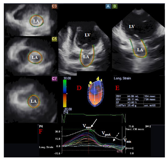 - Anwar, A.M.; Soliman, O.I.; Geleijnse, M.L.; Nemes, A.; Vletter, W.B.; ten Cate, F.J. Assessment of left atrial volume and function by real-time three-dimensional echocardiography. Int. J. Cardiol. 2008, 123, 155–161. [Google Scholar] [CrossRef] [PubMed]