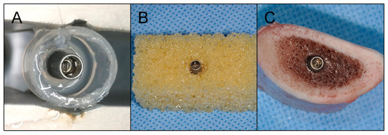 Placement of dental implants in model substrates. (A) Silicone simulating periimplant soft tissue, (B) polyurethane foam mimicking type IV alveolar bone with a circumferential defect and (C) bovine ribs.