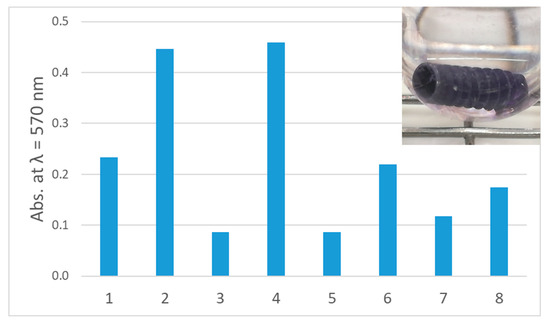Biofilm formation on implants. Quantitative analysis of biofilm formation: (1) B. pumilus, (2) B. subtilis, (3) C. albicans, (4) C. dubliniensis, (5) E. faecalis, (6) R. mucosa, (7) S. epidermidis, (8) S. sanguinis. Inset: Crystal violet staining of R. mucosa biofilm.