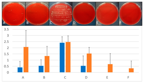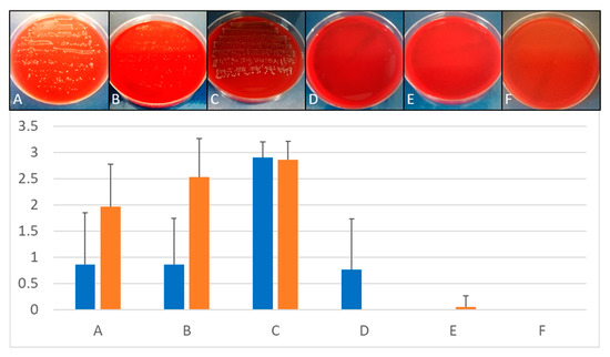 Treatment of E. faecalis biofilms. Upper panel: Comparison of growth on Columbia Blood Agar plates after different treatment of implants infected with E. faecalis and placed in silicone. Lower panel: Quantitative comparison of growth on implants inserted in silicone (blue bars) and polyurethane foam (orange bars) depending on treatment protocols. (A) Mechanical debridement, (B) air abrasion, (C) BDD treatment for 0 min, (D) BDD treatment for 5 min, (E) BDD treatment for 10 min, (F) BDD treatment for 15 min (n = 3 for each methods and time point). Growth of implant roll-outs was rated from 0 (no growth) to 3 (strong growth). Columns represent the mean of 3 independent biological replicated ± standard deviation (SD).