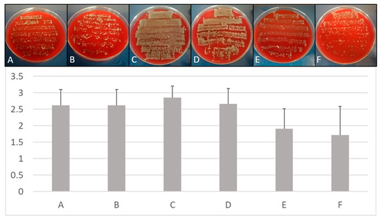After cleaning and disinfection, the implants were rolled five to seven times on Columbia Blood Agar plates (Oxoid, Wesel, Germany), which were subsequently incubated at 37 °C for one day. Bacterial growth was monitored and rated using an evaluation scheme adapted from a monitoring scheme of catheter infections [53]. To this end, each lane of the roll-out was rated from 0 (no growth) to 3 (strong growth) using a master sample as reference (Figure 4). All experiments were carried out in independent replicates (n = 3 biological replicates).
