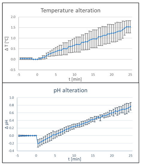 Minor temperature and pH-value changes were observed after applying the electrodes for approximately 25 min and hence would not be expected in a clinical setting where clearly shorter treatment times are needed. Even if these changes would occur, negative effects on the patient cannot be expected.