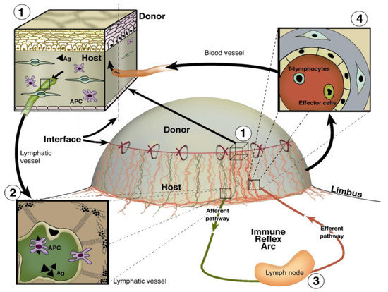 Important role of blood and lymphatic vessels in the high-risk corneal host bed as exit and entry routes of the immune reflex arc leading to immunologic graft rejection. (1) Magnification of the host–graft interface where blood (red) and lymphatic (green) vessels reach the graft. Antigen (Ag) and antigen-presenting cells (APCs) both of host and donor can leave the cornea using corneal lymphatics. (2) and migrate through corneal lymphatic vessels to the draining lymph nodes. (3) After stimulation of immune effector cells in the regional lymph node, T lymphocytes/effector cells can be released via the efferent blood vessels (4) and gain direct access to the transplant and initiate a rejection reaction (efferent arm of the immune reflex arc). (adopted from [4]).