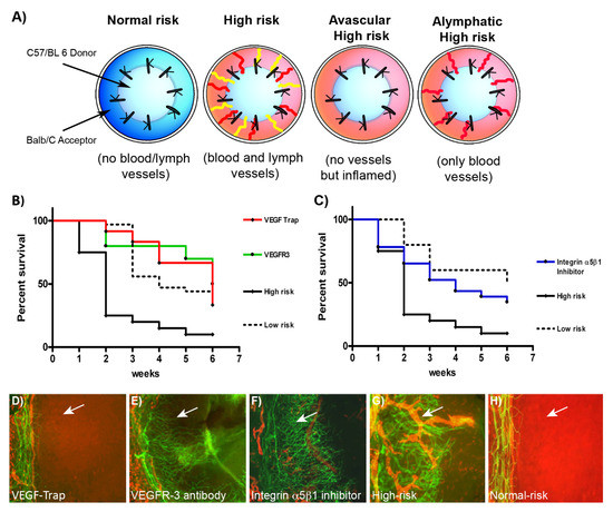 Lymphatic vessels in the recipient bed prior to transplantation determine graft survival. (A) Schematic diagram showing transplantation models normal-risk (avascular), high-risk (inflamed and hemvascularized and lymphvascularized), avascular high-risk (inflamed, avascular), and alymphatic high-risk recipient beds (inflamed and hemvascularized, but no lymphatic vessels). (B) and (C) Kaplan–Meier survival curve. To induce inflammation the suture-induced corneal neovascularization assay was performed two weeks prior transplantation and mice were treated with vascular endothelial growth factor (VEGF)-TrapR1R2 (B (red line) and D; no blood and lymphatic vessels, but reduced inflammation in the recipient bed), VEGFR-3 Ab (mF4-31C1) (B (green line) and E; only blood vessels present in the recipient bed), or integrin α5β1 inhibitor (JSM6427) (C (blue line) and F; only blood vessels present in the recipient bed). Graft survival was compared with prehemvascularized and prelymphvascularized controls (B and C (black line), G: “high-risk” recipient bed) and avascular recipient controls (B and C (dotted line), H: “low-risk” recipient bed). The graft survival was significantly better when transplants were placed into recipient beds lacking lymphatic vessels compared with beds with lymphatic vessels present. (VEGF-Trap versus high-risk: p < 0.0001; VEGFR-3 versus high-risk: p < 0.0002; n = 10; JSM6427 versus high-risk: p < 0.032, n = 23; Kaplan–Meier survival curve). (D–H) Corneal whole mounts stained for blood vessels (CD31, green) and for lymphatic vessels (LYVE-1, red) in different recipient beds. Representative images of recipient corneal beds at the time of transplantation after corneas were treated with (D) VEGF-TrapR1R2, (E) VEGFR-3 (mF4-31C1), (F) integrin α5β1 inhibitor (JSM6427), or (G) untreated high-risk and (H) normal-risk (original magnification × 100). Arrow, prevascularized cornea. (modified from [3]).
