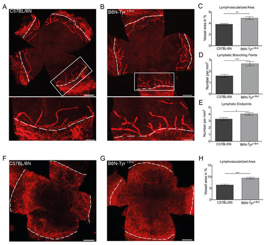 Absence of tyrosinase leads to increased developmental and inflammation-induced lymphangiogenesis (comparing C57BL/6N with B6N-Tyrc-Brd). (A) and (B) Corneal whole mounts of the murine cornea from C57BL/6N (A) and B6N-Tyrc-Brd (B) stained for LYVE-1. The boxed areas show in higher magnification of the limbal vasculature in the bottom panels. (C) Quantification of the lymphatic vascularized area of the whole mounts and determination of the number of branching points (D) and the number of endpoints (E). Results are presented as the average of C57BL/6N and B6N-Tyrc-Brd mice. F) and G): Corneal whole mounts of inflammation-induced lymphangiogenesis of C57BL/6N (F) and B6N-Tyrc-Brd (G) stained for LYVE-1. (H) Quantification of the inflammatory lymphatic vascularized area of the whole mounts. Dashed lines show the border between the limbus and the cornea. Statistical significance was calculated by two-tailed t-test. Data are expressed as means SEM. A, C-E n = 7 C57BL/6N mice; B, C-E n = 6 B6N-Tyrc-Brd mice; F-H n = 6. * p < 0.05, ** p < 0.01, and *** p < 0.001. Scale bars: 500 mm (A and B, upper panels, F, and G); 200 mm (A and B, lower panels). Original magnification, 100× (A, B, F, and G). (adopted form [137]).