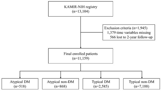 The Korea Acute Myocardial Infarction-National Institutes of Health registry (KAMIR-NIH) is a prospective, multicenter, nationwide observational cohort study (cris.nih.go.kr identifier: KCT-0000863). Patients diagnosed with AMI in 20 tertiary hospitals from November 2011 to December 2015 were enrolled in the study. The details of this study have been published previously [12]. This study was approved by the institutional review board of Chonnam National University Hospital (CNUH-2011-172) on 27 October 2011. The Institutional Review Board at each participating hospital approved the study protocol. Patients provided written informed consent to participate in this study. Among 13,104 patients, 1945 with missing values for symptom onset time, hospital arrival time, Thrombolysis In Myocardial Infarction (TIMI) flow grade, and 2-year follow-up loss were excluded (Figure 1). A total of 11,159 patients were categorized into four groups according to the presenting symptoms and history of diabetes (atypical DM, atypical non-DM, typical DM, and typical non-DM).