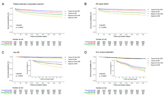 Diabetes mellitus (DM) is considered to have a risk equivalent to that of coronary heart disease, and global prevalence is gradually increasing [8,9]. Diabetic cardiovascular autonomic neuropathy contributes to inappropriate perception of chest pain [10]. A previous study including patients with suspected stable angina showed that the incidence rate of coronary events was higher among patients with typical chest pain, especially among diabetic patients, than that among patients with atypical chest pain [11]. Interestingly, atypical patients with diabetes experienced more coronary events than those without diabetes. Although the recent improvement in optimal medical treatment and device therapy has reduced cardiovascular events, better clinical outcomes of atypical chest pain in patients with AMI are still not established. Therefore, this study aimed to assess the long-term impact of atypical chest pain in AMI patients with or without DM.