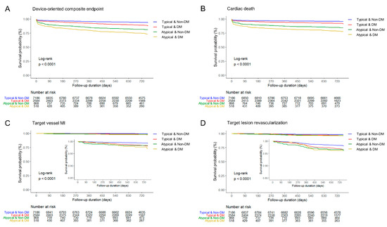 Two-year device-oriented clinical endpoint and individual clinical outcomes. (A) Device-oriented composite endpoint, (B) Cardiac death, (C) Target vessel myocardial infarction, and (D) Target lesion revascularization.DM, diabetes mellitus; MI, myocardial infarction.
