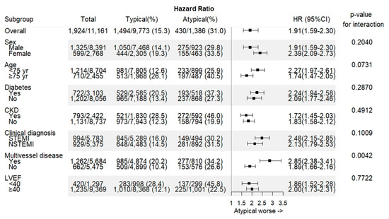 Median follow-up duration was 730 days (interquartile range 687–759 days). Overall in-hospital death occurred in 388 (3.5%) patients (Table 3). In-hospital death was significantly higher in patients with atypical chest pain among both DM and non-DM groups (11.6% vs. 3.8%, p < 0.0001; 7.8% vs. 2.3%, p < 0.0001, respectively). The incidences of POCE and all-cause death at 2-year were 17.2% and 9.7%, respectively. The 2-year rate of POCE and DOCE were about twice higher among patients with atypical pain than among those with typical chest pain. All-cause death and cardiac death rate were the main contributing factors of the difference. The 2-year cumulative incidence of all-cause death was highest in the atypical DM group (29.5%) among the four groups. In the logistic regression analysis, patients in the atypical DM group were at the highest risk of POCE (hazard ratio (HR) 1.76, 95% confidence interval (CI) 1.48–2.10), all-cause death (HR 2.23, 95% CI 1.80–2.76), and any MI (HR 2.34, 95% CI 1.51–3.64) in adjusted models (Table 4), as well as DOCE (HR 2.16, 95% CI 1.72–2.72), cardiac death (HR 2.27, 95% CI 1.75–2.94), and target vessel MI (HR 2.17, 95% CI 1.05–4.49). All estimated HRs for clinical endpoints were statistically significant (p for trend < 0.0001) among the four groups. The cumulative incidences of primary and secondary clinical endpoints were significantly different (log-rank p < 0.0001) (Figure 2 and Figure 3). Atypical chest pain was consistently worse in the subgroup analysis of interest for POCE (Figure 4). Patients with multivessel disease were associated with worse clinical outcomes (p-value for interaction = 0.0042).