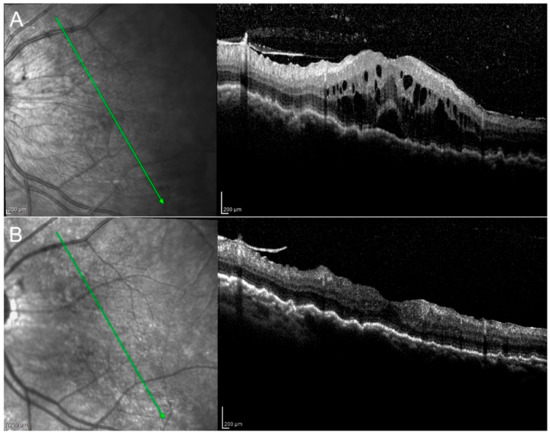 Macular Edema (ME) represents the most common cause of sight loss among uveitis patients, because of its influence on “central vision” [7,10,11], and it has been found to be more common in those forms of uveitis that affect the more posterior structures of the eye [12]. Rothova et al. [13] showed that 45% of patients with posterior uveitis presented visual impairment, and 28% of them also had ME [4,13]. Uveitic ME is defined as a thickening of the macular region due to an inflammatory breakdown of the outer and/or inner blood–retina barrier (BRB) with consequent leaking from perifoveal capillaries and the accumulation of intracellular and extracellular fluid [14]. BRB breakdown may result from a strong inflammatory context and be due to many factors including vascular endothelium growth factor (VEGF), pro-inflammatory cytokines such as TNF-α, IL-1, TGF-beta, angiotensin II, IL-6, and IL-8, and metalloproteinases secreted by leukocytes [4,15,16].