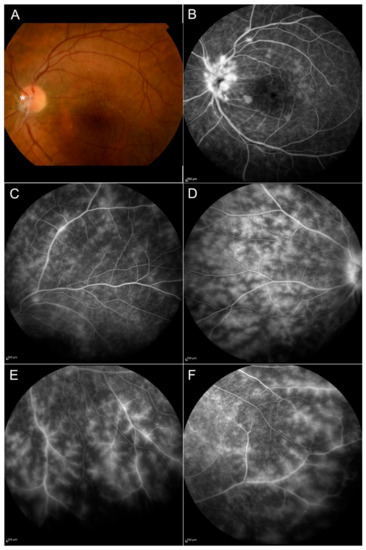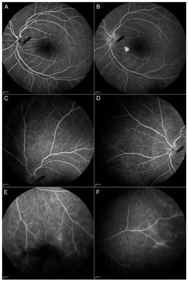 Follow-up at month 12 (M12) of the patient shown in Figure 2. Blood–retinal barrier alterations are still evident at the posterior pole from the early (A) to the late phases (B) of Fluorescein Angiography (FA). Peripheral vasculitis (C–F) and optic disc inflammation (A,B) are reduced compared to baseline but can still be appreciated in the inferior and the temporal sector of the peripheral retina (E and F, respectively).