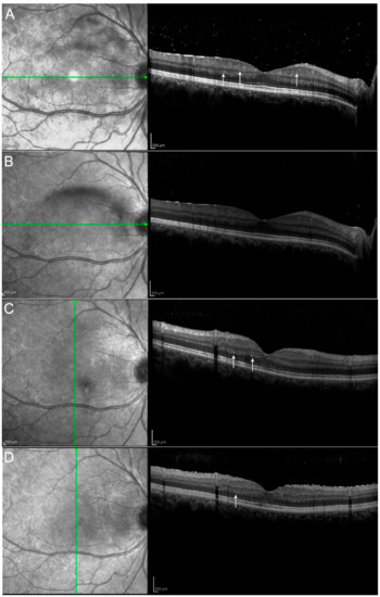 - Pohlmann, D.; Macedo, S.; Stübiger, N.; Pleyer, U.; Joussen, A.M.; Winterhalter, S. Multimodal Imaging in Birdshot Retinochoroiditis. Ocul. Immunol. Inflamm. 2017, 25, 621–632. [Google Scholar] [CrossRef]