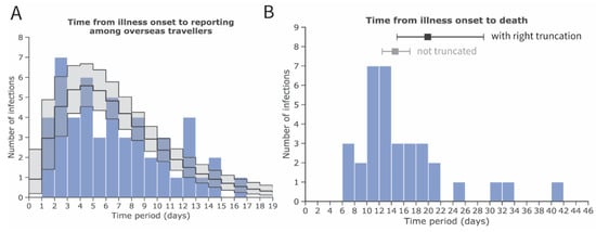 Estimates of the mean and standard deviation (SD) of the time from illness onset to reporting and death cases, accounting for right truncation, with novel coronavirus (COVID-19) infection in China, 2020. Inference of A and B was conducted among (A) exported cases observed in other countries and (B) deceased cases in China. (A) Frequency distribution of the time from illness onset to reporting among exported cases employing a gamma distribution with a mean of 7.1 days (95% confidence interval [CI]: 5.9, 8.4) and SD of 4.4 days (95% CI: 3.5, 5.7). (B) Frequency distribution of the time from illness onset to death with a mean of 19.9 days (95% CI: 14.9, 29.0) (shown in black) and SD of 11.4 days (95% CI: 6.5, 21.6) employing a lognormal distribution and accounting for right truncation. For reference, the estimate of the mean and its 95% credible intervals without accounting for right truncation are shown in grey. The values for distribution of time from illness onset to death are adopted from an earlier study []. The blue bars show empirically observed data collected from governmental reports (as of 24 January 2020).