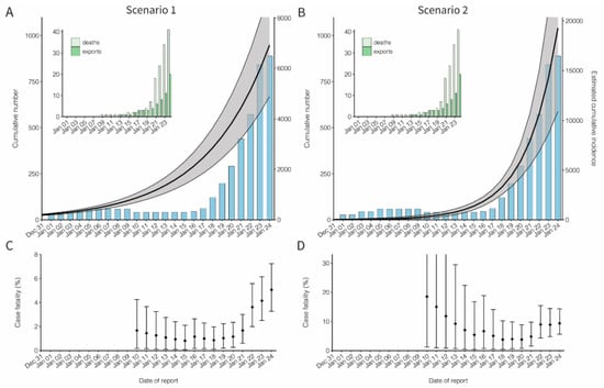 Cumulative incidence and the confirmed case fatality risk of the novel coronavirus (COVID-19) outbreak in China, 2020. (A,B) Observed and estimated cumulative number of cases in China by the date of report. An exponential growth curve was extrapolated using the exported case data. Scenario 1 extrapolated the exponential growth from December to first case on 8 December 2019, while Scenario 2 started the estimation of the exponential growth only from 13 January 2020. The black line and shaded area represent median and 95% credible interval of the cumulative incidence in China, respectively. The blue bars show the cumulative number of reported cases from the government of mainland China. The cumulative number of reported cases was not used for fitting, but it was shown for comparison between the cumulative number of reported and estimated cases in China. There is a decrease in the cumulative number of reported cases in early January, because only 41 cases tested positive for the novel coronavirus among the reported 59 cases on 10 January 2020. Left-top panels on both A and B show the cumulative numbers of exported cases observed in other countries and the cumulative number of deaths in China, represented by dark and light green bars, respectively. (C,D) Confirmed case fatality risk (cCFR) by the date of reporting. Each value of cCFR was estimated as the ratio of cumulative number of estimated incidence to death at time t. The points and error bars represent the median and its 95% credible interval of the cCFR. All 95% credible intervals were derived from Markov chain Monte Carlo simulations.