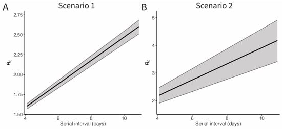 We estimated the basic reproduction number for the COVID-19 infection, using the estimated exponential growth (r) and accounting for possible variations of the mean serial interval (Figure 3). Assuming that the mean serial interval was 7.5 days [], the basic reproduction number was estimated at 2.10 (95% CI: 2.04, 2.16) and 3.19 (95% CI: 2.66, 3.69) for Scenarios 1 and 2, respectively. However, as the mean serial interval varies, the estimates can range from 1.6 to 2.6 and 2.2 to 4.2 for Scenarios 1 and 2, respectively.