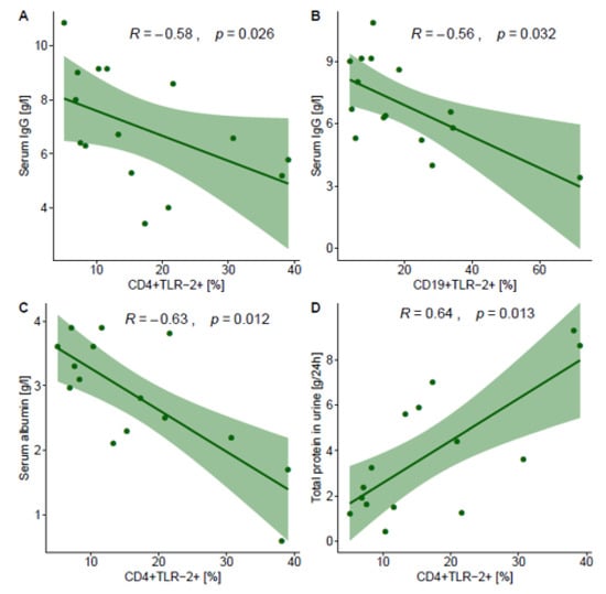 Next, we investigated the relationship between TLR2 expression and the laboratory parameters that showed statistical differences (i.e., urine protein excretion and the serum concentrations of urea, BUN, IgG, IgA, total protein, and albumin). In patients with PGN, the frequencies of CD4+TLR-2+ cells and CD19+TLR-2+ cells correlated negatively with the concentration of IgG (rho = −0.579, p = 0.026; rho = −0.561, p = 0.032, respectively; Figure 1). Moreover, the frequency of CD4+TLR-2+ cells in patients with PGN correlated negatively with the concentration of albumin (rho = −0.631, p=0.012; Figure 1) and positively with urinary protein excretion (rho = 0.636, p = 0.013). The remaining correlations were not significant. Table 4 shows all Spearman correlation coefficients.