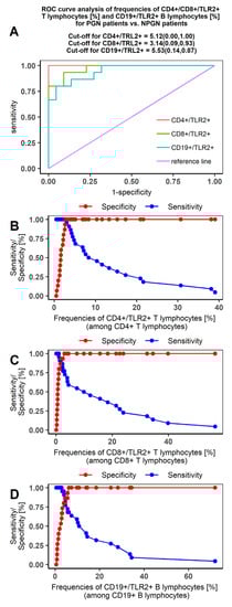Receiver operating characteristic (ROC) curve analysis showing the sensitivity and specificity of TLR2 expression to distinguish between patients with non-proliferative (NPGN) and proliferative glomerulonephritis (PGN). (A) ROC curve analysis for CD4+/CD8+/TLR2+ T lymphocyte (%) and CD19+/TLR2+ B lymphocyte frequencies (%); (B) sensitivity/specificity curve for CD4+/TLR2+T lymphocytes (%); (C) sensitivity/specificity curve for CD8+/TLR2+ T lymphocytes (%); (D) sensitivity/specificity curve for CD19+/TLR2+B lymphocytes.