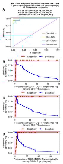 Our ROC curves comparing PGN and NPGN patients were characterized by high sensitivity for each of the T and B lymphocyte datasets (Figure 2). The area under the curve (AUC) value indicated high specificity for distinguishing PGN from NPGN patients. Furthermore, the most differentiating indicator for both groups of patients was the expression of TLR2 on the CD4+ T lymphocyte subset (AUC = 1; Table 5).