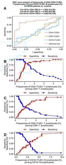 Receiver operating characteristic (ROC) curve analysis on the sensitivity and specificity of TLR2 expression to distinguish between NPGN patients and controls. (A) ROC curve analysis for CD4+/CD8+/TLR2+ T lymphocyte and CD19+/TLR2+ B lymphocyte frequencies (%) in NPGN patients; (B) sensitivity/specificity curve for CD4+/TLR2+T lymphocytes (%) in NPGN patients; (C) sensitivity/specificity curve for CD8+/TLR2+T lymphocytes (%) in NPGN patients; (D) sensitivity/specificity curve for CD19+/TLR2+B lymphocytes (%) in NPGN patients.