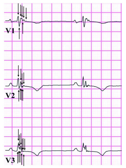 - Cox, M.G.; Nelen, M.R.; Wilde, A.A.W.; Wiesfeld, A.C.; Smagt, J.J.; Loh, P.; Cramer, M.J.; Doevendans, P.A.; Tintelen, J.P.V.; de Bakker, J.M.P.; et al. Activation delay and VT parameters in arrhythmogenic right ventricular dysplasia/cardiomyopathy: Toward improvement of diagnostic ECG criteria. J. Cardiovasc. Electrophysiol. 2008, 19, 775–781. [Google Scholar] [CrossRef]