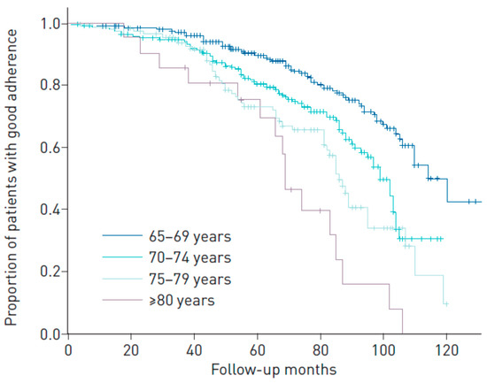 Kaplan-Meier curves according to age group for the percentage of patients with a CPAP compliance of at least four hours/day during follow-up. Martinez-Garcia et al. ERJ Open Res. 2019 Mar 4;5(1). pii: 00178-2018, with permission.