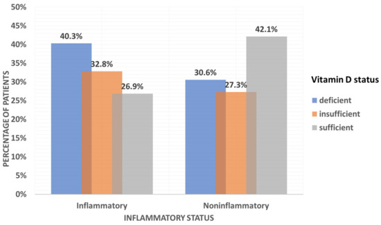 Nonlinear correlations of ESR, albumin, transferrin, hsCRP and fecal calprotectin with selected vitamin D parameters are presented in Table 4. Serum 24,25OH2D levels were negatively correlated with ESR (−0.155, p = 0.049), while concentrations of serum 1,25OH2D correlated positively with hsCRP (0.157, p = 0.036). Both correlations were weak but significant. Weak positive correlations with serum VDBP levels were found for ESR (0.150, p = 0.049), transferrin (0.160, p = 0.037) and hsCRP (0.261, p < 0.001). The calculated levels of serum free and bioavailable 25OHD showed a weak negative correlation with ESR (−0.165, p = 0.031, −0.205, p < 0.001, respectively), hsCRP (−0.164, p = 0.032, −0.208, p < 0.001 respectively) and a moderate negative correlation with fecal calprotectin (−0.377, p = 0.028, −0.409, p < 0.016, respectively). Serum total 25OHD concentration was the only vitamin D parameter found to have no specific correlation with any of the inflammatory markers (Table 4). There was also no statistically significant difference in serum total 25OHD levels between the inflammatory and non-inflammatory groups (Table 2). When the study population was classified according to vitamin D status using serum 25OHD levels (where vitamin D sufficiency was defined as 30–100 ng/mL, insufficiency as 21–29 ng/mL and deficiency as < 20 ng/mL [40]), the proportion of patients with active inflammation was observed to be higher in the groups with vitamin D deficiency and insufficiency (Figure 1). However, correlations between serum 25OHD and inflammatory parameters were not statistically significant (Table 4).