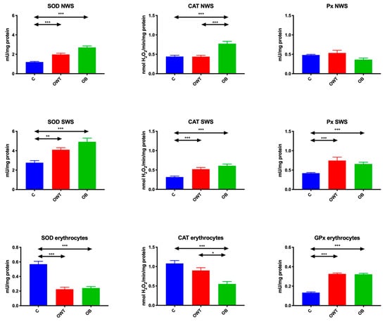Enzymatic antioxidants in overweight and obese adolescents as well as healthy controls. C- control, CAT- catalase, NWS- non-stimulated whole saliva, OB- obese, OWT- overweight, Px- salivary peroxidase, SOD- superoxide dismutase, SWS- stimulated whole saliva. Differences statistically significant at: * p < 0.05, ** p < 0.005, *** p < 0.0005.