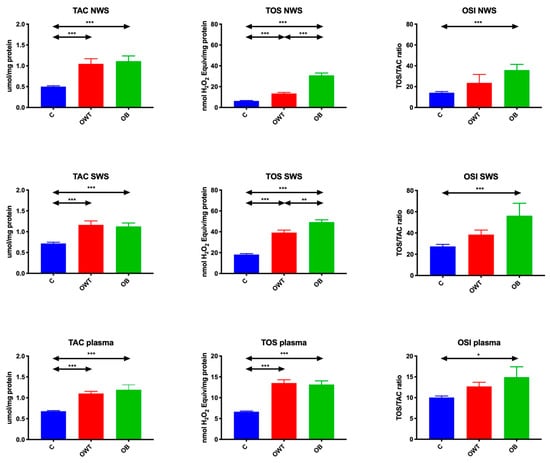 Redox status in overweight and obese adolescents as well as healthy controls. C- control, NWS- non-stimulated whole saliva, OB- obese, OSI- oxidative stress index, OWT- overweight, SWS- stimulated whole saliva, TAC- total antioxidant capacity, TOS- total oxidative status. Differences statistically significant at: * p < 0.05, ** p < 0.005, *** p < 0.0005.