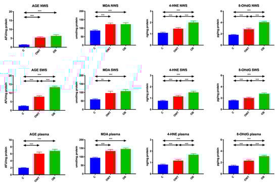 TOS in non-stimulated (↑113%, p < 0.001; ↑288%, p < 0.001, respectively) and stimulated (↑115%, p < 0.001; ↑170%, p < 0.001, respectively) saliva as well as plasma (↑103%, p < 0.001; ↑97%, p ≤ 0.001, respectively) of overweight and obese adolescents was significantly raised compared to the control group. TOS in non-stimulated (↑129%, p < 0.001) and stimulated (↑25%, p = 0.001) saliva of obese teenagers was considerably higher than in their overweight peers.