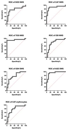 Particular attention should be paid to SOD, CAT, TOS and OSI in NWS, GSH and AGE in SWS, and CAT in erythrocytes—the AUC of which is close to 1.0, which differentiates overweight adolescents from obese ones (Figure 6).