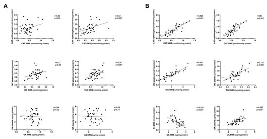 Saliva–blood correlations of the analyzed redox biomarkers in healthy controls (A) as well as overweight and obese adolescents (B). CAT- catalase, NWS- non-stimulated whole saliva, SWS- stimulated whole saliva, TAC- total antioxidant capacity, UA- uric acid.