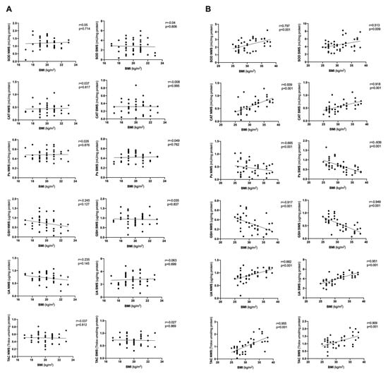 Correlations between BMI and salivary antioxidants in healthy children (A) as well as overweight and obese adolescents (B). BMI- body mass index, CAT- catalase, GSH- reduced glutathione, NWS- non-stimulated whole saliva, Px- salivary peroxidase, SOD- superoxide dismutase, SWS- stimulated whole saliva, TAC- total antioxidant capacity, UA- uric acid.