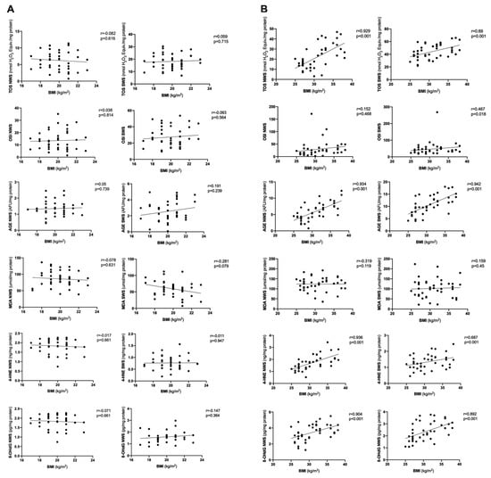 Correlations between BMI and salivary oxidative damage in healthy children (A) as well as overweight and obese adolescents (B). BMI- body mass index, AGE- advanced glycation end products, MDA- malondialdehyde, NWS- non-stimulated whole saliva, OSI- oxidative stress index, SWS- stimulated whole saliva, TOS- total oxidative status, 4-HNE- 4-hydroxynoneal protein adduct, 8-OHdG- 8-hydroxy-D-guanosine.