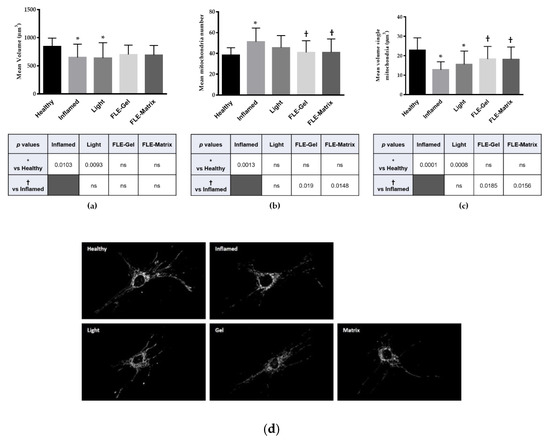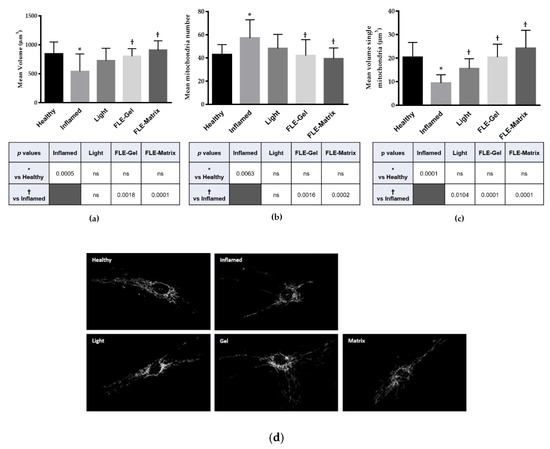 Quantification of mitochondrial network 30-min post-treatment. After deconvolution, images were 3D reconstructed and the mitochondrial network was evaluated by automated estimation of (a) volume of the entire mitochondrial network per single cell, (b) number of mitochondria per single cell, and (c) volume of single mitochondrion. Data are expressed as mean ± SD. Multi comparison statistical analysis were performed by using one-way analysis of variance (ANOVA). T tests were performed on all pairwise comparisons between group means. * p < 0.05 from Healthy human dermal fibroblasts (HDFs), † < 0.05 from Inflamed human dermal fibroblasts (HDFs), ns = not significant. (d) Representative images. FLE: fluorescent light energy.