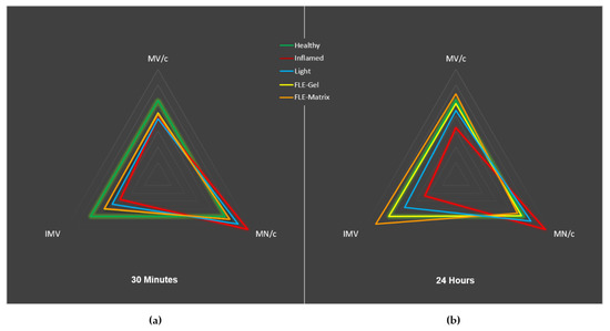 Radial graphs depicting relative changes in mitochondrial networks at (a) 30-min and (b) 24-h post-treatment. All parameters are indexed to Healthy-HDFs (green). Inflamed-HDFs are depicted in red, Light-treated HDFs in blue, FLE-Gel in yellow, and FLE-Matrix in orange. At time point 30-min the FLE-Gel (yellow) and FLE-Matrix (Orange) overlap, and at time point 24-h the Healthy (green) and FLE-Gel (yellow) overlap. MV/c = Mitochondria Volume per cell; MN/c = Mitochondria Number per cell; IMV = Individual Mitochondrion Volume.