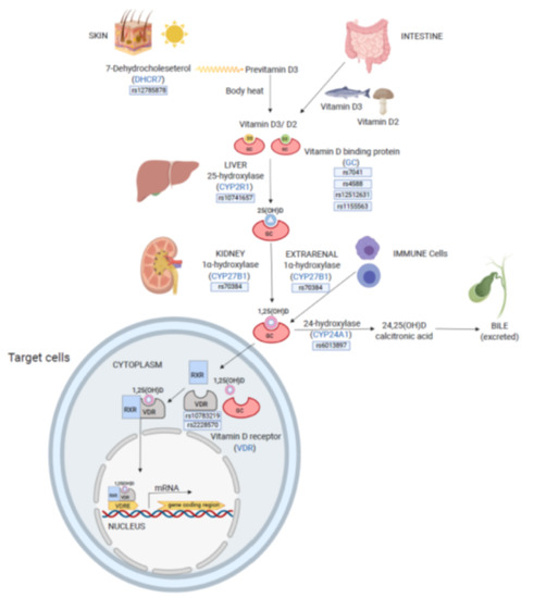 Results of twin studies have shown a heritable component of circulating 25(OH)D concentrations, with heritability rates ranging from 29% to 77% [8,9,10]. In large genome-wide association studies (GWAS), it has been reported that single nucleotide polymorphisms (SNPs) in the vitamin D binding protein (group specific component (GC)) as well as in enzymes related to activation or degradation of vitamin D and its metabolites are of similar importance for serum 25(OH)D levels as the effect of season [11,12,13,14] These polymorphisms influence 25(OH)D levels derived from endogenous production via ultraviolet light (UV) exposure as well as the increase of 25(OH)D levels after vitamin D intake by food.