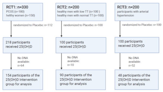The inclusion criteria for the present investigation were completion of the vitamin D RCTs and allocation to the intervention group of vitamin D which were for RCT1: 218, for RCT2: 100 and for RCT 3: 100 participants.