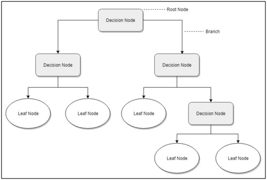 The decision tree [72] is an algorithm that uses a tree-shaped structure to model the relationships between the characteristics. This structure begins in a trunk known as root node and is divided into branches. Decisions are made in each of these divisions or decision nodes. Finally, it ends up reaching the leaf nodes where the data is homogeneous enough not to continue dividing them further.