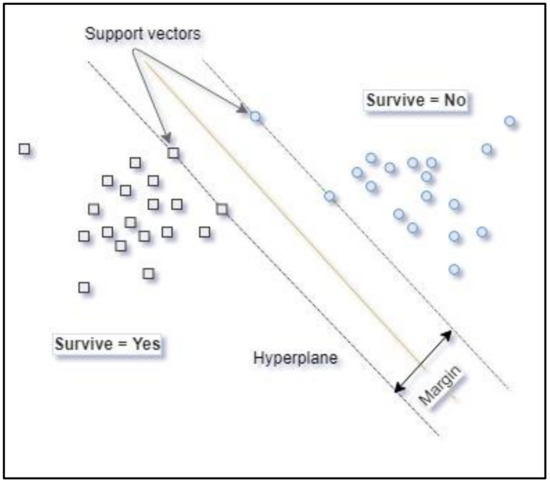 The machine learning technique known as support vector machine [60] (SVM) uses entry data represented in a features space that can have multiple dimensions and generates an optimal function for separation of the values of the variable to be modelled. If the population is separable or quasi-separable (presence of noise), a linear function that can separate the data in the original space of the entry samples is used. When the population is not linearly separable, a kernel function is used to transform the original entry data and take them to a new space of features where the hyperplane can achieve linear separation of the classes in the variable to be modelled. Figure 3 shows that the separation hyperplane is equidistant from the closest observations in each class to constitute a maximum margin on either side of the hyperplane. The support vectors are the observations on the border of these margins. A more detailed explanation of SVM can be found in Appendix A.