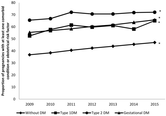 Temporal trends in the proportion of pregnancies in women with type 1 diabetes (T1DM), T2DM, and gestational diabetes with at least one comorbid condition (excluding diabetes) compared with women without diabetes. * p < 0.05 for trends.