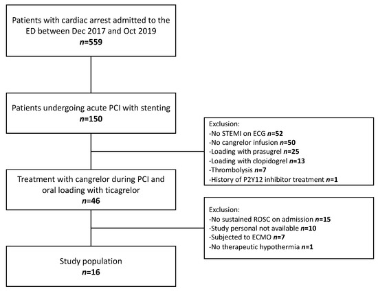 - Fiore, M.; Gerbaud, E.; Coste, P.; Cetran, L.; Marchand, H.; Seguy, B. Optimal platelet inhibition with cangrelor in comatose survivors of out-of-hospital cardiac arrest undergoing primary percutaneous coronary intervention. Resuscitation 2018, 130, e1–e2. [Google Scholar] [CrossRef] [PubMed]