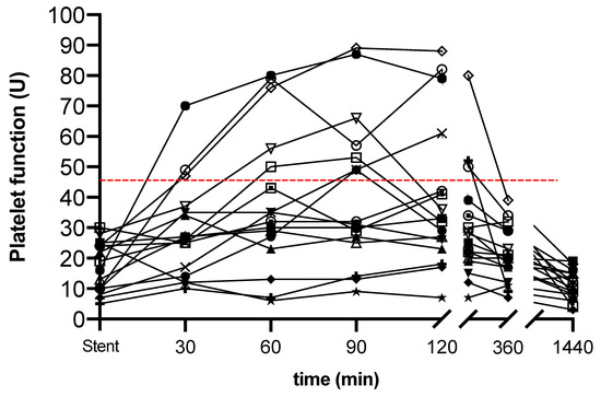 Platelet function from coronary stent placement (stent) to 24 h after end of cangrelor infusion (x-axis) was measured using whole blood aggregometry and is given in U (y-axis). Minutes 30 to 1440 refer to the time after cangrelor cessation. Cangrelor sufficiently inhibited P2Y12 at the time of coronary stent placement. Transitioning to ticagrelor within 39 min (IQR 5–50) before cangrelor cessation resulted in high platelet reactivity (HPR) in 44% (7/16) of patients within the first 90 min after end of cangrelor infusion. Red dashed line, HPR threshold of >46U.