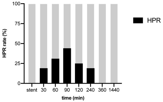 The primary endpoint was the rate of HPR (%) at predefined time points during the first 24 h after cangrelor cessation. Secondary endpoints were the rate of HPR at the time of stent placement and the relationship between the overlap time of cangrelor and ticagrelor co-administration (time of ticagrelor administration before cangrelor cessation) and the number of subsequent HPR episodes. The study was approved by the Ethics Committee of the Medical University of Vienna (EC# 1674/2013) and conducted in accordance with the latest version of the Helsinki declaration. A waiver for written informed consent was obtained from the Ethics Committee. The consent was permanently waived if the patient did not regain consciousness. Those who regained consciousness were informed of their participation as soon as they were able to understand the purpose of the study.