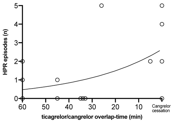 Relationship between the overlap time of cangrelor and ticagrelor co-administration (x-axis) and the number of high platelet reactivity (HPR) episodes after cangrelor cessation (y-axis). HPR episodes significantly increased with decreasing ticagrelor/cangrelor overlap time.