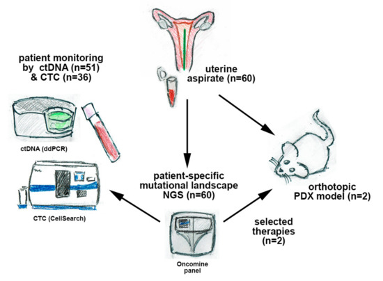 In this work, we developed an integrated strategy using different types of liquid biopsy in patients with EC to provide valuable and complementary information for the management of advanced disease. For this purpose, we performed targeted next-generation sequencing (NGS) on UA samples from a cohort of 60 patients with EC and monitored patient-specific mutations by droplet digital PCR (ddPCR) in cfDNA. In addition, we evaluated the clinical utility of cfDNA and CTCs in these patients; designed targeted therapies based on the molecular landscape; and finally, validated the therapies in patient-derived xenografts (PDXs) generated after orthotopic implantation of UA (scheme in Figure 1).