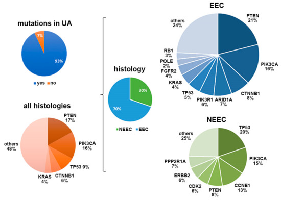 Summary of the most prevalent altered genes in UAs and their distribution according to tumor histology. UA, uterine aspirate; EEC, endometrioid carcinomas; NEEC, non-endometrioid carcinomas.