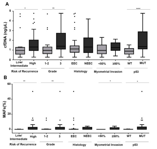 (A) Cell-free DNA (cfDNA) levels at surgery, grouped according to tumor grade, myometrial infiltration, risk of recurrence, and p53 status. (B) MAF (mutated allelic frequency) levels of the patient-specific point mutations, analyzed by ddPCR and grouped according to tumor grade, myometrial infiltration, risk of recurrence, and p53 status (n = 51). p53 was considered either mutant or wild type on the basis of immunohistochemistry analysis of primary tumors and UA sequencing. Mann–Whitney U tests were used to calculate the p-values. * p < 0.05, ** p < 0.01, **** p > 0.0001.