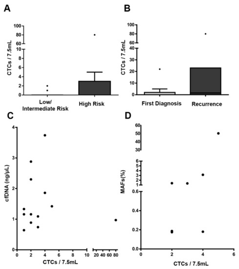 CTC enumeration with the CellSearch system. (A–B) CTC levels according to the risk of recurrence and the disease status at sample collection (first diagnosis versus recurrent disease). (C) Correlation between cfDNA concentration and CTC count. (D) Correlation between ctDNA levels (MAFs) and CTC count; n = 33 patients for ctDNA and CTC comparisons.